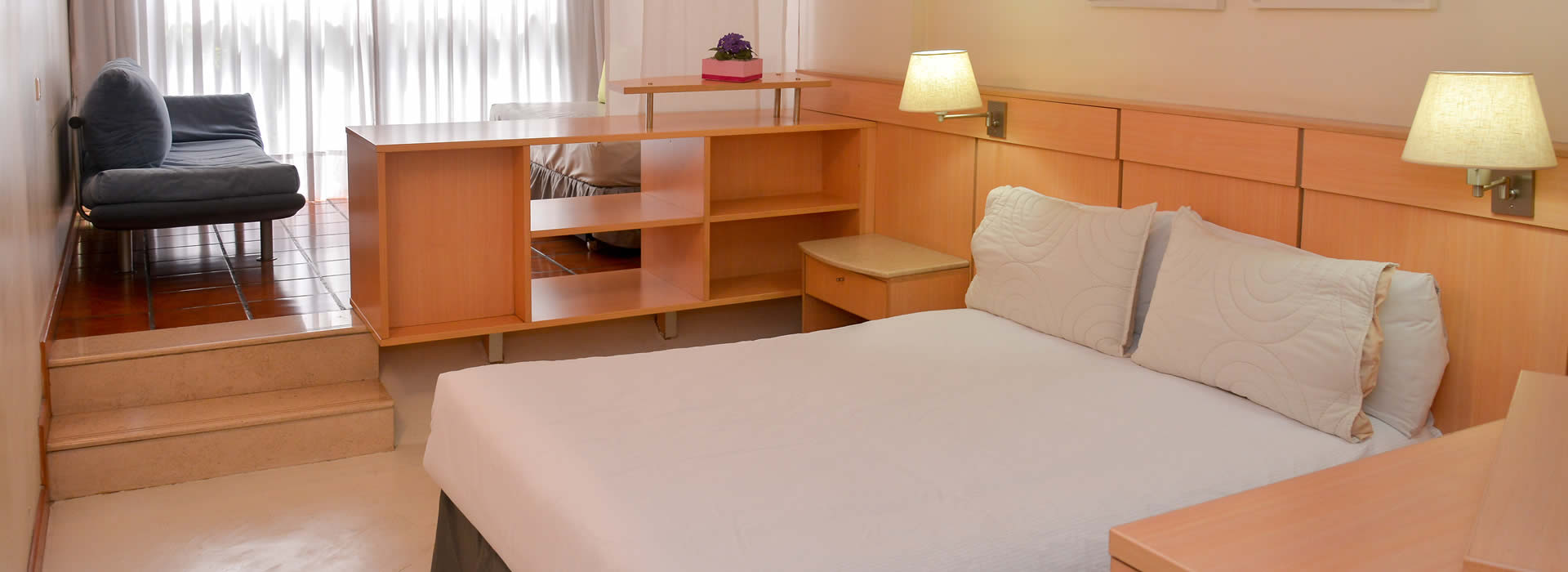 Cama de casal ou 2 camas individuais e sala de estar com espreguiçadeira.